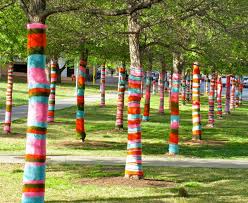 Yarn bombing, yarnbombing, yarnstorming, guerrilla knitting, urban knitting or graffiti knitting is a type of graffiti or street art that employs colorful displays of knitted or crocheted yarn or fiber rather than paint or chalk.